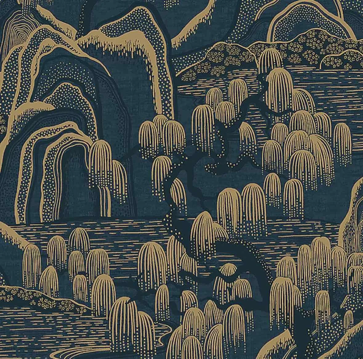 The pattern of “Indigo Garden” is a delightful fusion of botanical elements, featuring billowing trees, hilltops, and rippling lakebeds. The flowing lines and organic shapes evoke a sense of movement, as if the garden itself is alive and thriving. This enchanting design invites a sense of calm and serenity, perfect for creating a peaceful retreat in your home.