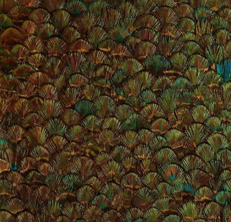 Each panel is further elevated by the incorporation of genuine peacock feathers. These exquisite feathers are ethically collected and individually adhered to the wall covering, creating a mesmerizing shimmer and unparalleled texture. The iridescent quality of the peacock feathers enhances the emerald tones, bringing an added layer of natural opulence that is both captivating and utterly unique.